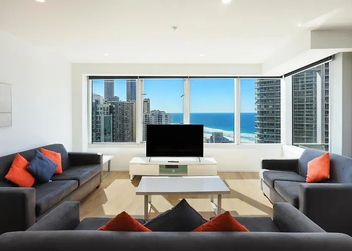 The spacious Q Tower Amazing Ocean Views 22Nd Level Heated Pools Sleeps 6 - Optimise Bnb Gold Coast apartment is 25 minutes' walk from Macintosh Island Park in the Coloane district and welcomes guests with a sauna and an indoor pool. Nestled a stone's throw from the SkyPoint Observation Deck, this apartment offers an indoor pool with a pool bar.